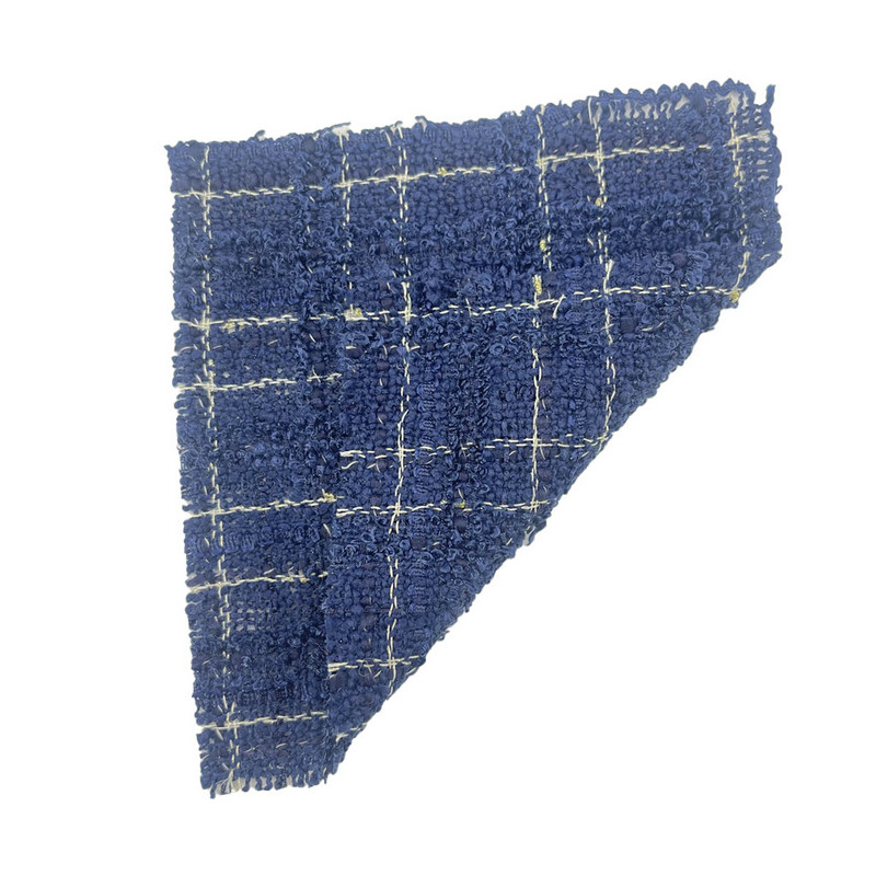 Questo tessuto, designato come articolo 19909-10, è un tweed di poliestere al 100% progettato per l'abbigliamento femminile. Con una massa areica di 558 g/m, presenta una struttura di peso medio. La base blu scuro è tessuta con un motivo scozzese, integrato con filato metallico durante il processo di produzione. Questa combinazione crea un contrasto sia nelle proprietà visive che tattili. La composizione interamente in poliestere garantisce stabilità dimensionale e prestazioni costanti. L'inclusione di elementi metallici aggiunge dettagli che riflettono la luce alla superficie tessile. Queste caratteristiche rendono il tessuto adatto per capi di abbigliamento in cui l'integrità strutturale e l'effetto decorativo sono prioritari.