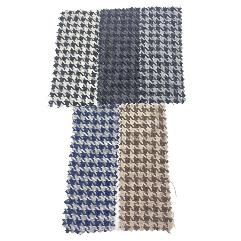 Questo tessuto, denominato articolo 3946, è un tessuto composto per il 10% da lana e per il 90% da altre fibre. Con una massa per unità di superficie di 450 g/m, presenta una costruzione di peso medio. La superficie grigio scuro presenta un motivo pied de poule, realizzato attraverso una specifica tecnica di tessitura che produce quadri spezzati o forme a quattro punte. Questo classico motivo geometrico è caratterizzato dal suo ripetuto effetto tonale contrastante. La composizione in misto lana contribuisce alla regolazione termica e alla resilienza del tessuto. Queste caratteristiche tecniche si traducono in un materiale con un'articolazione del modello definita e una durabilità strutturale, rendendolo applicabile alle felpe con cappuccio dove sono richieste la definizione del modello visivo e prestazioni a lungo termine.