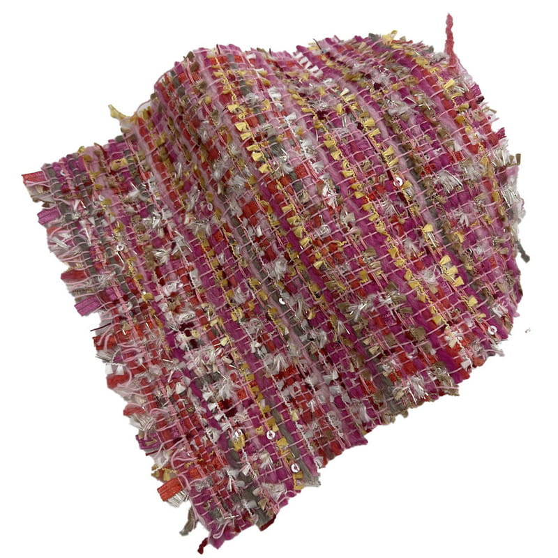 Questo tessuto, designato come articolo 21003, è un tessuto tweed composto da 67% poliestere e 33% acrilico. Con una massa per unità di superficie di 385 g/m², presenta una struttura di peso medio. Il tessuto incorpora paillettes rosse e rosa combinate con filato metallico, integrato durante il processo di tessitura per creare una superficie riflettente dispersa. La base in poliestere fornisce stabilità strutturale, mentre il componente acrilico contribuisce alla morbidezza e alla consistenza del tessuto. Questa combinazione si traduce in un materiale con diversa riflessione della luce e dimensionalità superficiale. Queste caratteristiche tecniche rendono questo tweed applicabile per capi di abbigliamento da donna dove sono richiesti elementi decorativi e integrità strutturale.