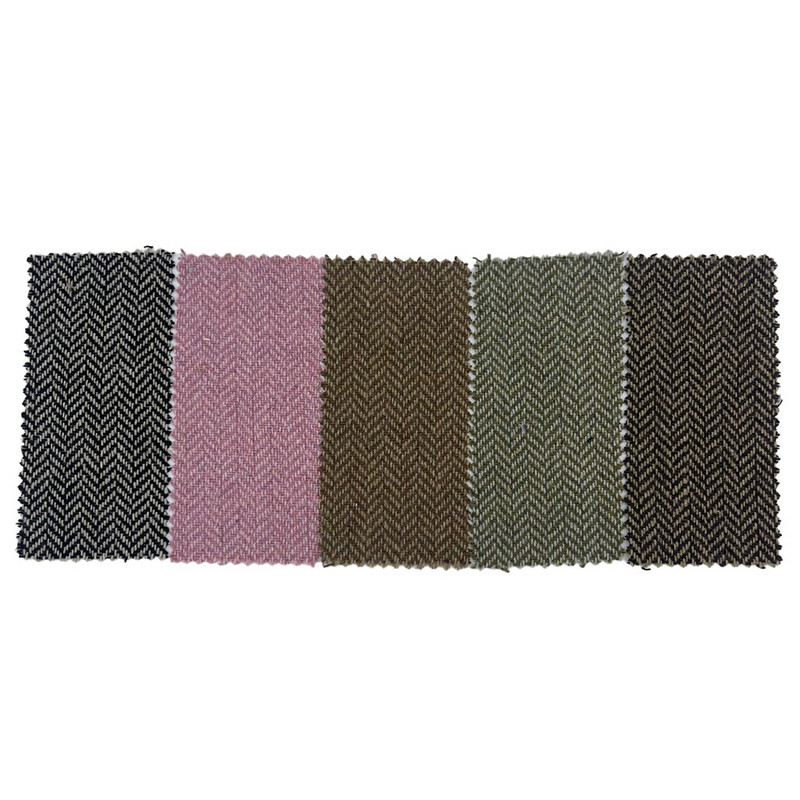 Questo tessuto, denominato articolo 3532, è un tessuto jacquard composto da 20% lana e 80% altre fibre. Con una massa per unità di superficie di 500 g/m, presenta una struttura di peso medio-pesante. La superficie rosa è caratterizzata da un motivo a spina di pesce, realizzato attraverso il processo di tessitura jacquard, che forma precisi motivi a V sul tessuto. Questa tecnica produce una trama direzionale coerente con ripetizione geometrica definita. La composizione in misto lana contribuisce alle proprietà termiche del tessuto e al mantenimento della forma. Queste caratteristiche tecniche si traducono in un materiale con densità strutturale e chiarezza del disegno, che lo rendono applicabile ai pantaloni dove sono richieste sia definizione visiva che stabilità dimensionale.